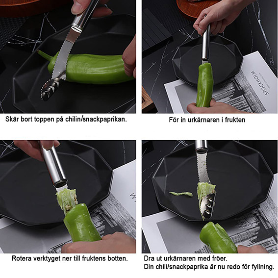 Denna praktiska urkärnare av rostfritt stål för chili och snackpaprika medföljer på köpet.